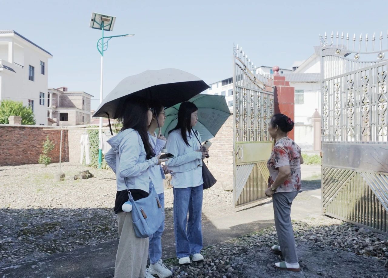迎着东照的阳光,绿意乡行的队员们抵达新人村进行调研和访谈。过程中,队员走访到一户杨姓阿姨的家中,刚开始杨阿姨对成员的到来略显陌生和拘谨,但在成员道明来意后,杨阿姨热情地接待我们。队员们向杨阿姨提问几个简单的调研问题,从家庭情况、庭院现状、生活品质提高等方面进行访谈。刚开始杨阿姨说:“我们都没读过书,都不懂这些的。”但调研组队员们耐心引导,热情解答,用温暖的笑容打消了杨阿姨心中的顾虑。杨阿姨详细地回答调研问题,并且分享家庭情况和对庭院改造的看法为调研团队提供了宝贵的一手资料。通过深入访谈,实践团成员不仅收集到详实的数据资料,还了解到了杨阿姨在乡村发展进程中的真实感受,以及未来对美丽庭院的改造期望。