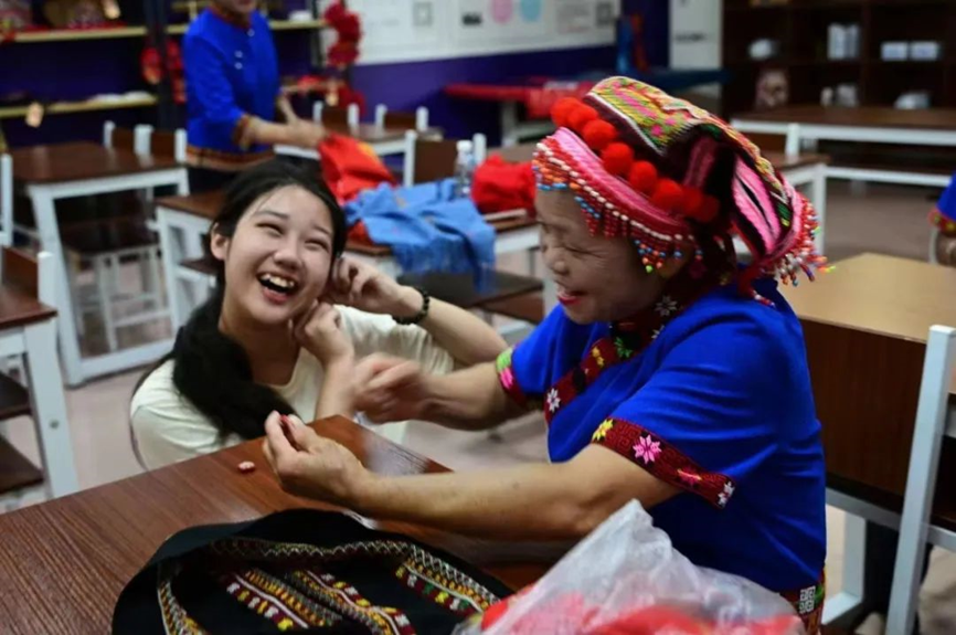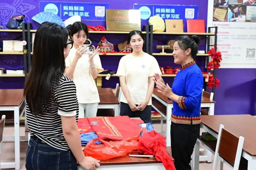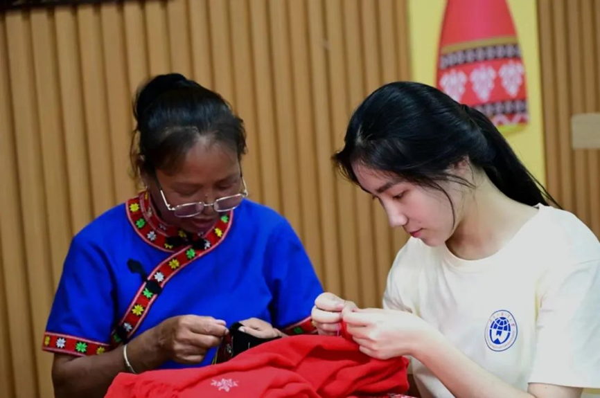 当地的绣娘也对这份业余的绣品工作展现出极大的热情,她们认为,这不仅让她们可以利用业余的时间赚钱补贴家用,更重要的能让自己民族的文化被更多的人看到,让瑶绣能够走出去。(下图为队员在学习瑶绣)