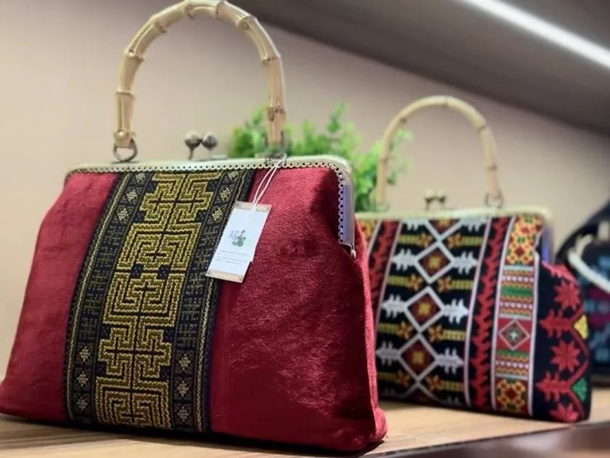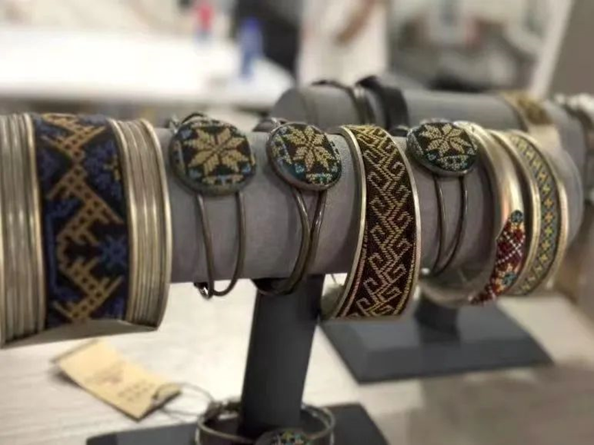在游溪镇政府的支持下,我们参观了当地的工坊,采访了工坊的绣娘。工坊中可以看到,当地政府高度重视瑶绣的创新性发展。在制作产品过程中,突破原本瑶族刺绣的创作形式限制,大胆寻求形式创新,将瑶绣产品运用到年轻群体喜闻乐见的耳饰、手环当中。众多具有瑶绣风格的箱包、手串、项链在独居瑶族民族特色的基础上,更加生活化,融入到当代年轻人的生活中。