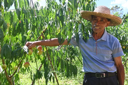 桃农展示他种植的鹰嘴桃