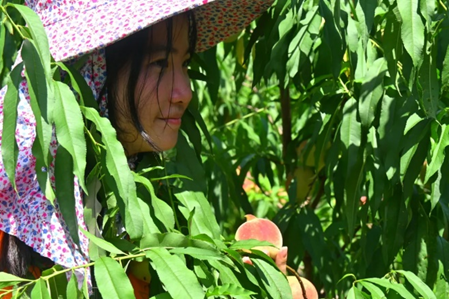 实践队员于连平县上坪镇东阳村和小水村的桃园进行实践走访与调查,行走在山间桃园之中,周边溪水环绕,桃树的绿与桃果的红点缀其中。