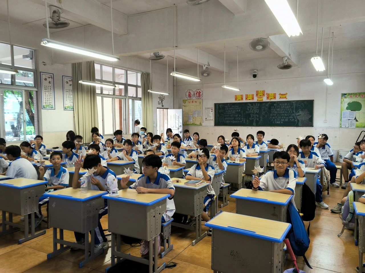 折纸课后同学们高兴地展示成果