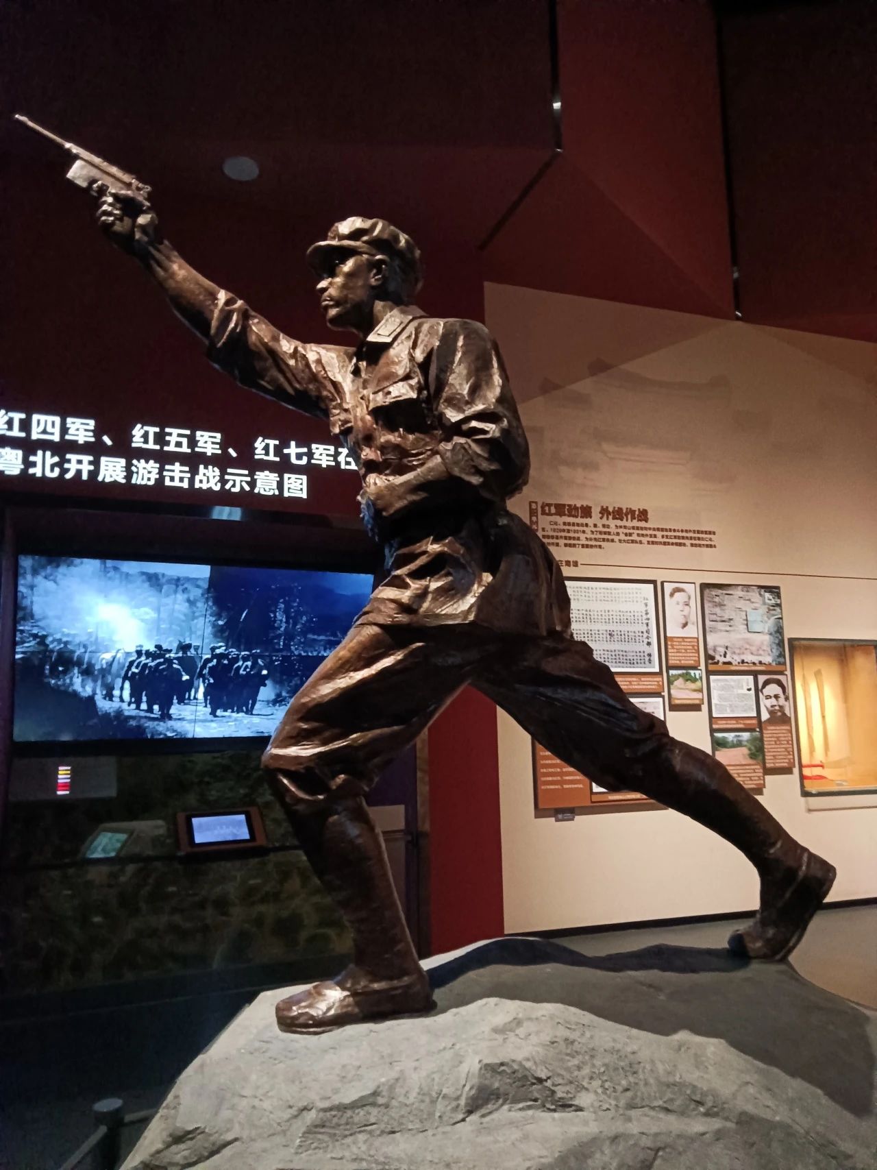 眼前,一尊气势磅礴的李谦纯铜雕塑巍然矗立,突破常规,以实心纯铜精心浇铸,生动再现了他牺牲瞬间——手护中弹腹部,力竭仍紧握指挥之姿,眼神中透出不可动摇的坚毅。凝视之下,瞬间穿越至烽火连天的岁月,感受红军战士无畏生死、誓死抗争的壮丽精神。