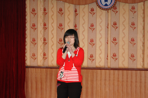 伴随着青春动感的伴奏,首先上场的是09法B的庄淑敏。作为唯一参赛的09级新生,辨识度极高,甜美而富金属感的嗓音,令她为大家留下了极其深刻的印象。一首《A 20 ans》(中文译名《在20岁》)唱出了正当韶华的少女心声。