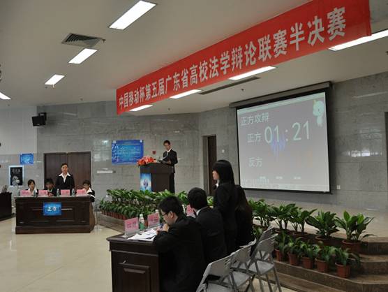2010年4月24日下午,第五届广东省高校法学辩论联赛半决赛在华工模拟法庭隆重举行。比赛由《南方日报》主任项仙君、律师陈军、华工知识产权学院法律系主任夏正林、张友好老师及徐清飞老师担任评委。我校法学院辩论队作为四强队伍之一华丽亮相,与广工辩论队围绕“人肉搜索利大于弊还是弊大于利”上演了一场激烈的唇枪舌战。