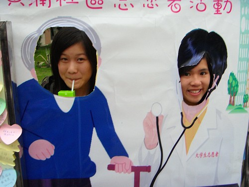 展示摊位中最有趣的要数义诊的“cosplay(角色扮演)”了,参加者可以在一块画有义诊医生给老人看病情景的纸板上扮演老人或者医生的脸,然后让工作人员拍照。扮演者摆出各种各样的表情实在让人忍俊不禁。“角色扮演”吸引了不少的同学前来观摩。