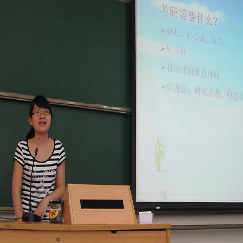 第二位上台的是来自06级统计班,已经考上中国人民大学统计学研究生的张永霞。她告诉了大家考研需要什么。考研需要毅力、好心态、信心、有规律的作息时间和好的方法。好方法具体就是指要会研究真题,稳扎稳打,熟能生巧。在备考过程中,明确不是在和别人竞争,而是在和自己竞争。