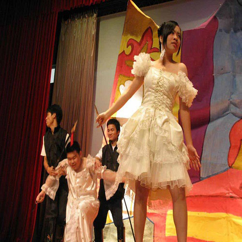 画着藏有笑脸的树,青葱翠绿的花草,童话般的城堡,还有高大的蘑菇,以青绿为底色的幕布,尽显仙境的奇幻。软件工程二班的《Alice in Wonderland》(《爱丽丝梦游仙境》)中,奇形怪状的水壶、杯子;会说话的古怪的兔子;“纸牌们”伴着身穿火红华丽宫廷服的皇后,尽情起舞;一切都让人觉得像在睡梦中旅行,奇幻有趣。而演员们夸张的语气,颇具感染力的身体语言,还有奇怪的发型,形象的妆容,梦幻的服饰,极具舞台效果,活泼地上演了一场穿行在梦中的奇遇。