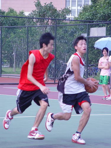 男子总决赛更加精彩,球员们用各自的进攻方式向在场的观众提供了一份视觉享受饕餮大餐。 “零记录”是由红衣队——07工管人资电商队(以下简称“红队”)4号队员揭聪定投投进2分打破,而白衣队——08营销工管人资队(以下简称“白队”)5号队员李立紧随其后跳投得两分,为白队首开纪录。第一节比赛,双方出手投篮的次数多,但命中率较低,由于双方球员较慢热,两队的失误及犯规次数也比较多。但接下来,白队的势头愈加上劲,以6-0的比分逼得红队叫了暂停。经过短暂的战术讨论后后,红队开始进行巧妙的配合,努力将比分追上,最终男子第一节比分为36-16,白队领先。二节开始,场上遭遇“进球荒”,场上局面的扭转是由红队28号队员以一记完美的2分向现场观众展示完美的射球弧线开始的,其后红队16号球员则以自己高超的中投技术为红队再添6分,白队则在此节比赛表现平平,上半场的比分为41-33,白队领先。