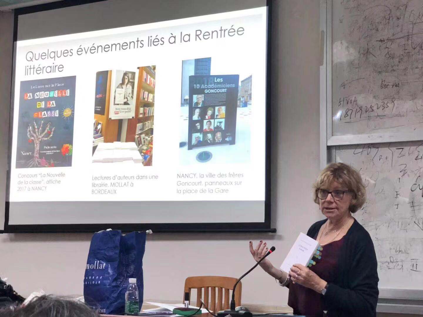 Dominique Macaire教授用轻松幽默的方式为法语系师生介绍了法国每年8月底至9月初举办的“文学回归季”。每年的“文学回归季”,法国各出版社会向读者推荐数百本新书,主要是新兴作家的作品。同时,Dominique Macaire教授还简要介绍了法国的主要文学奖项,并为师生们介绍了今年获得龚古尔文学奖的作家及其作品,如得主尼古拉·马修(Nicolas Mathieu)的《及其后代子孙》(Leurs enfants après eux) ,大卫·欧迪(David DIOP)的《灵魂兄弟》(Frère d’âme)。