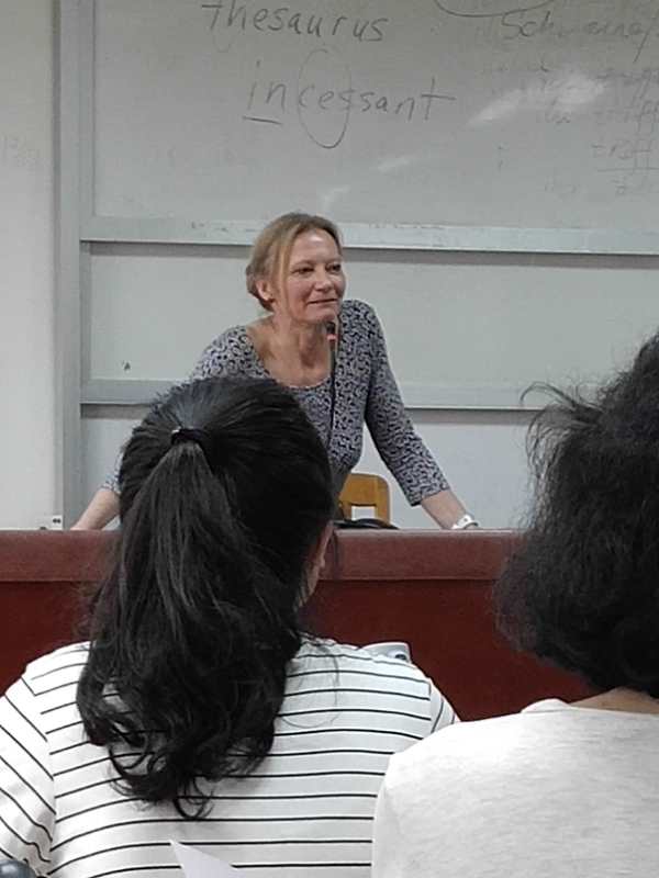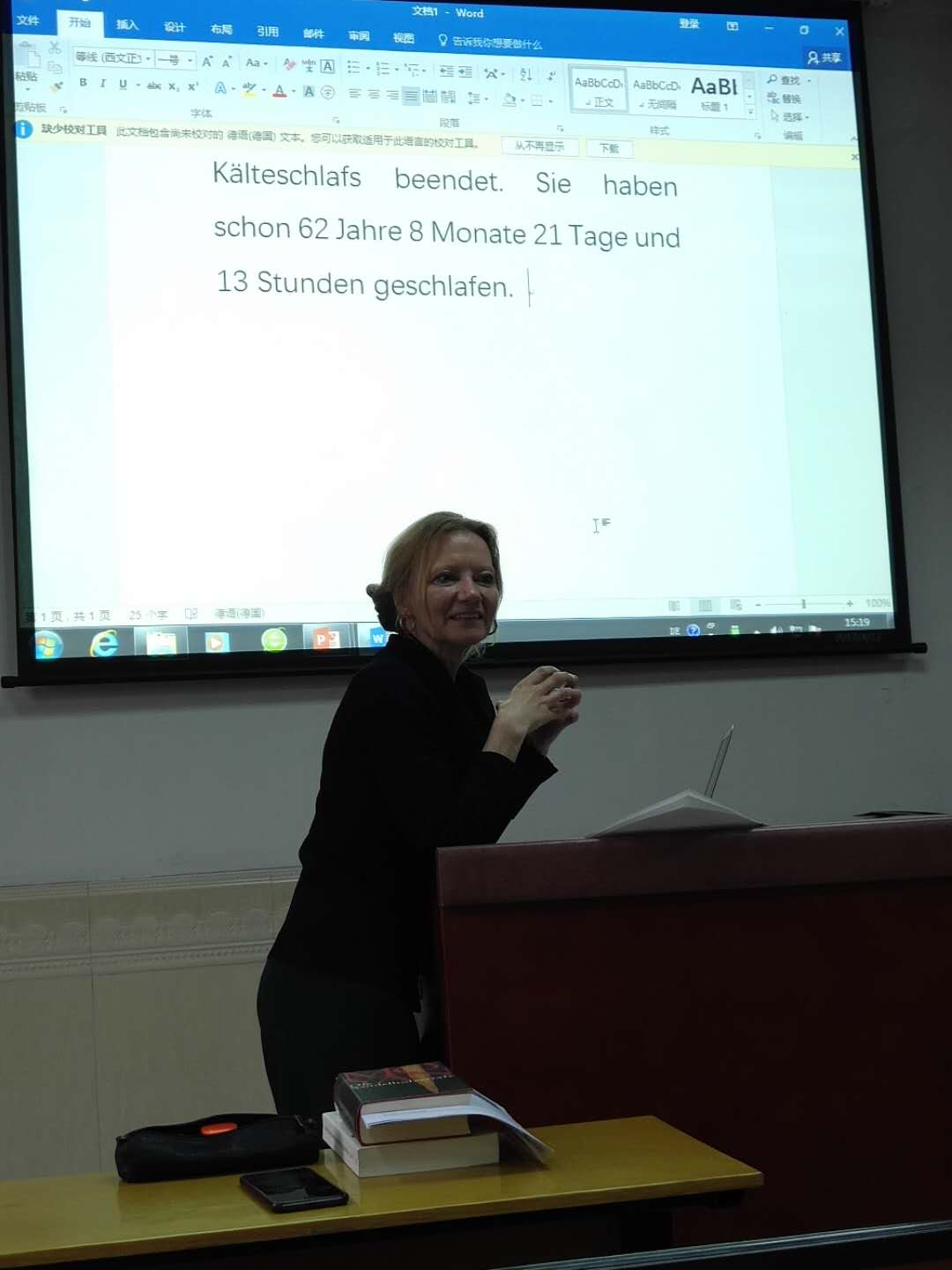 本网讯 2019年4月11日和12日,德国汉学家、翻译中国当代文学的德国知名翻译家Karin Betz女士前来广外西方语言文化学院,为德语系的师生带来了两场精彩的学术活动。Karin Betz现执教于德国哥廷根大学,是莫言、刘慈欣、金庸等知名中国作家的德语译者。