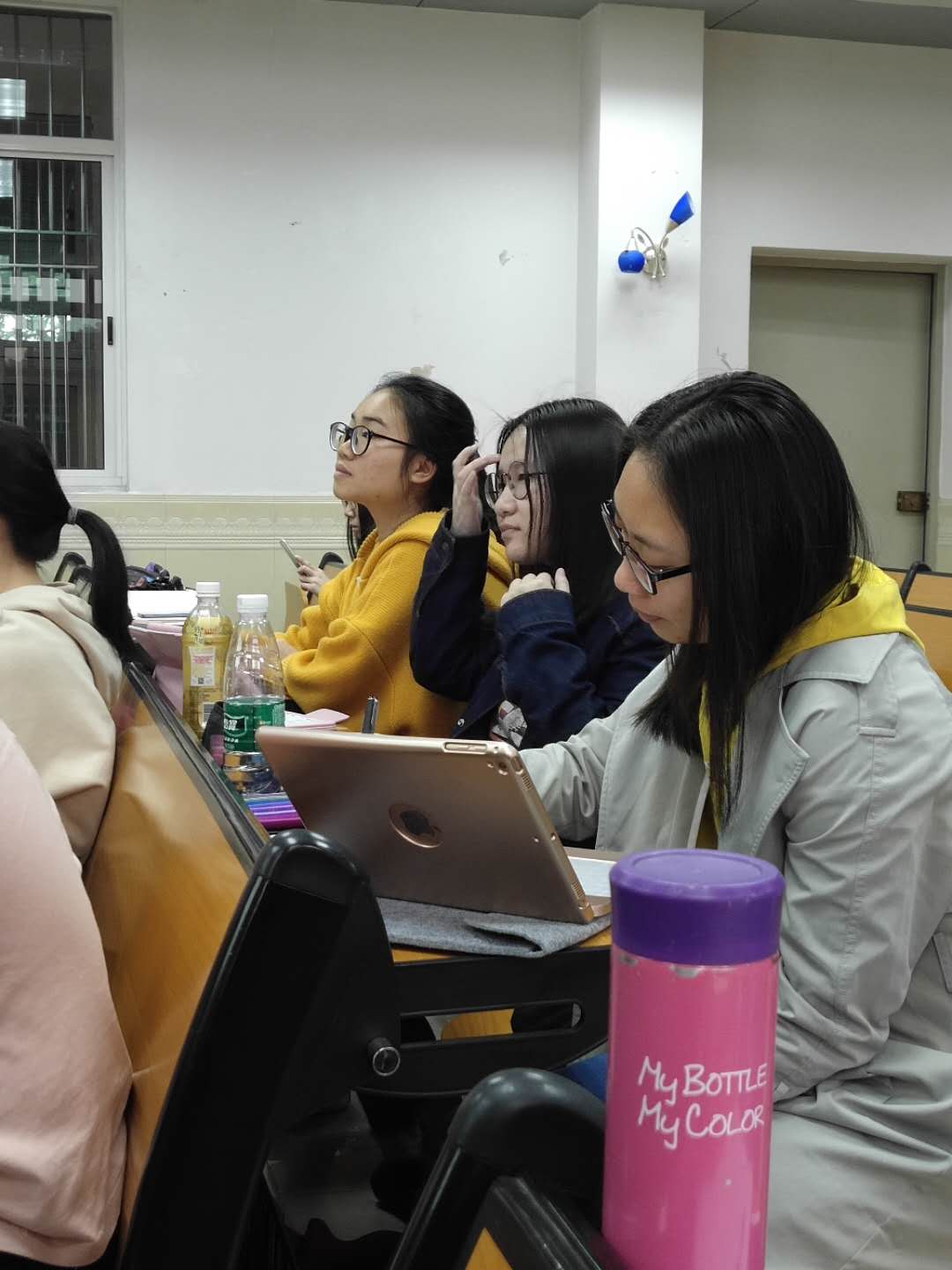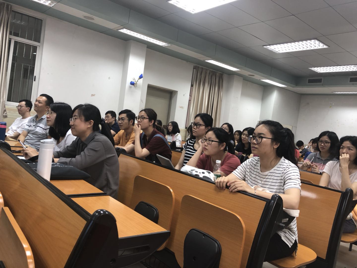 之后,4月12日下午14:00,Karin Betz在四教424为德语系学术硕士和专业硕士单独开设了翻译研讨活动,并吸引了德语系的部分本科生前来参加,该活动由中德文学关系创新团队成员、德语系教师崔涛涛博士主持。活动开始,Betz女士以反映文学特点语言差异的典型翻译例句作为开场引入,让同学们体会了托马斯曼的《魔山》在翻译成汉译、以及金庸的《射雕英雄传》在翻译成德语时所面临的困难,此后选取了刘慈欣的三体系列第三部《死神永生》的部分片段,引导学生分析作品的文本特点,展开内容讨论,并鼓励学生参与现场翻译,与学生一起讨论翻译问题,使学生们对文学翻译有了新的认识和了解,并引发大家的深刻思考在场学生都表示受益匪浅。
