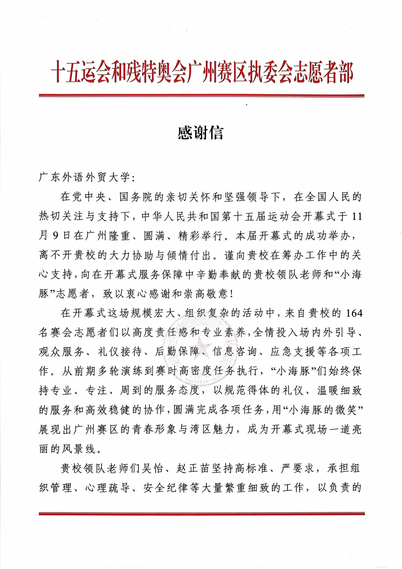 2025年十五运会和残特奥会广州赛区执委会志愿者部感谢信
