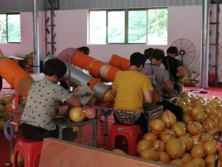 在加工厂的另一角,我们能看到二三十余名工厂工人为今早洗涤后的柚子上保鲜膜和套网装袋,准备装车。 蜜柚包装工人大多是来自梓里村的村民,且以女性居多,男性多承担采摘运输蜜柚的工作。只见工人动作娴熟,配合默契,转眼间一袋袋金黄诱人的柚子已经包装完毕,等待装车运往各个销售点。