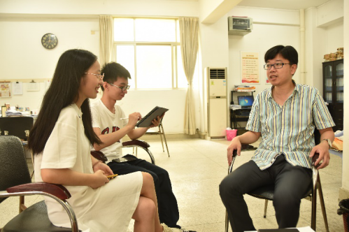 随后是正式的采访,现场有负责记录、录音以及摄影的队员。因为在展示区主任对潮剧教育板块做了一个浅显的说明,于是队员们以此作引,根据准备好的采访问题,与教导主任开始了由浅至深的交流。在这过程中,关于潮剧与网络文化、潮剧教育与网络对接的问题教导主任都给出了非常独到的见解和颇为语重心长的建议。他认为目前广为人知的“可持续发展”观念也同样适用于潮剧“上网”这一新兴的过程。但同时他也毫不避讳地表示潮剧“上网”的成效是非常不显著的,并且给队员们简单分析了背后的直接和间接原因,对此,队员们受益匪浅,发现潮剧真真正正想要在网络上有所作为是需要多方力量共同努力的,其中,足够的财力政策支持更是潮剧在网络时代能够有所突破的重要原因。
