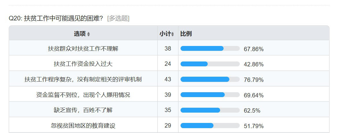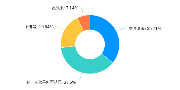 我们的问卷是从大车田村的脱贫效果,背后原因及未来发展方向进行提问。通过回收的问卷,我们发现有较大比例的村民认为扶贫是有效果的,小部分村民认为没效果。其中百分之35.71%的人认为效果显著,百分之37.5%的人认为有一点效果但不明显,有7.14%的人认为没效果,有19.64%的人则认为不清楚。由此我们可以得出该村近几年的扶贫工作取得了一定的效果,但要做到让更多的村民认同发展成果,还需要不断努力。