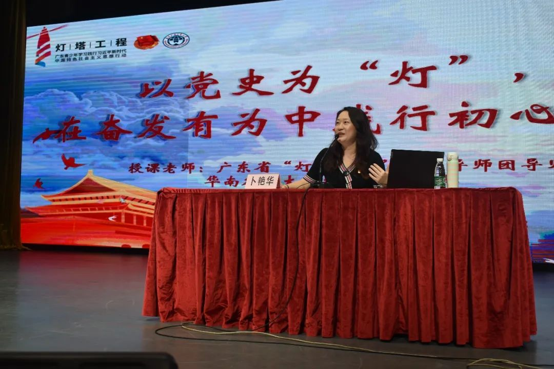 在培训大会的第二阶段,由华南农业大学马克思主义学院副教授、“灯塔工程”广东省青年导师团导师卜艳华老师进行专题授课。授课围绕着“以党史为‘灯’,在奋发有为中践行初心使命”徐徐展开。卜老师用慷慨激昂的语调为同学们介绍了近代中华民族救亡图存的道路探索历程。从中共一大至十九大、从以中国在新时代的历史定位为发端,深刻阐述中国在不同时代的历史使命,引导新青年要增强做中国人的志气、底气和骨气,不负时代,不负韶华,不负党和人民的殷切期望,做堪当民族复兴重任的时代新人。