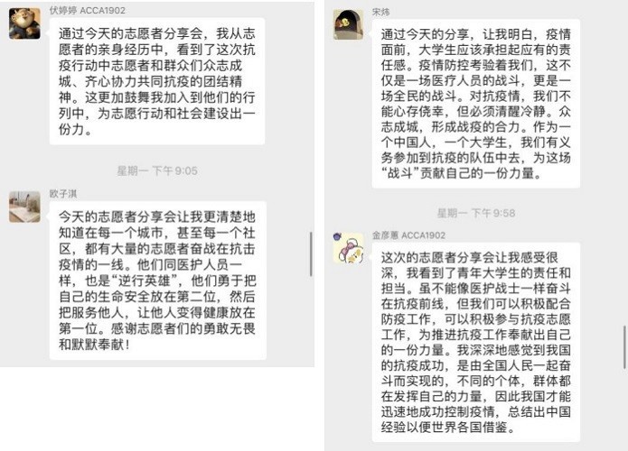 在“研青年奉献,展青年风采”志愿者分享会,我们邀请了两位志愿者来分享他们在疫情防控下的志愿经历与感悟,观众听后也有许多感悟。