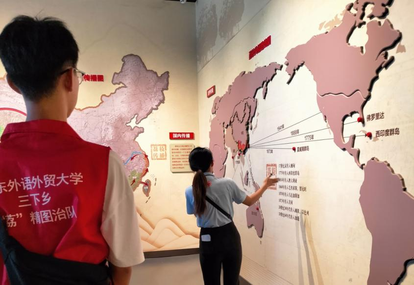 参观过程中队伍重点关注了荔知与荔业部分:首先,荔知部分运用电子资料设备并采用图文结合的方式,将荔枝的产区、品种、栽培技术、保险技术和加工体系展示出来。了解完荔枝的品类与各项特点,队员们深刻认识到,在荔枝的全产业链中,荔枝的生长结果特性、果实生理特性、要求种苗培育、病虫害防治、保鲜贮运、加工和综合开发等都必须具有与之相适应的技术配套。接着,荔业部分着重指出保鲜和储存问题是长久以来影响荔枝国内外销售的一个难题。目前,在现有的技术中,发挥重大作用的有解决最先一公里冷链保鲜问题的田头小站和短途、中途、长途、国际保鲜贮运技术。但队员们也提出,尽管在保鲜和储存方面已经有发挥重要作用的技术,但是这些技术仍旧无法实现大规模的荔枝保鲜,因此,保鲜和储存问题的解决仍需要有创新的想法与可落地的措施。在上午的博览馆参访学习中,队员们深切领悟到当地特色荔枝文化魅力,并体会到荔枝作为当地特色农产品对发展乡村振兴和文旅结合的重大意义。