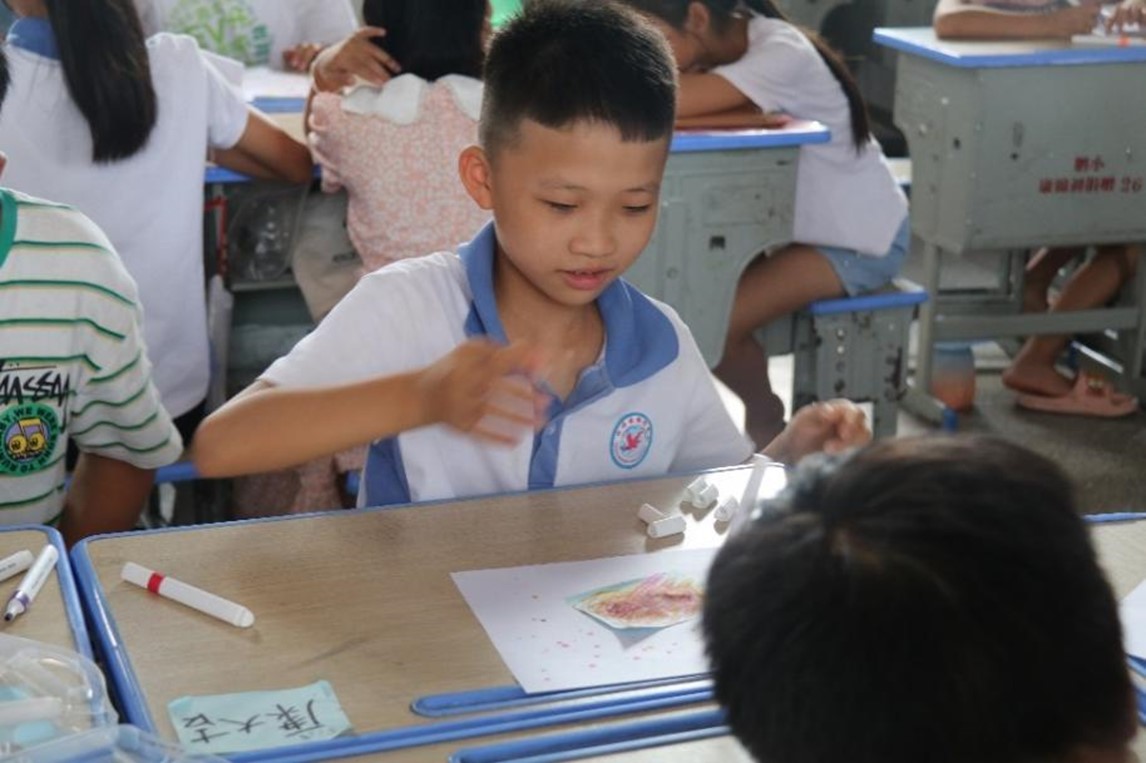 在教学活动的开始,实践团首先开展了唤醒学生的晨读课程,希望通过对诗歌的朗读、赏析和演绎,让孩子们感受到文字与色彩交融的奇妙效果。在晨读课程中,实践团成员谢思思带领孩子们在理解诗歌作者的情感和理念的同时引导他们学习不同颜色的含义和象征,进而引导学生思考如何运用色彩来展现自己的思想和情绪。随后,谢老师引导学生创作色彩涂抹画作,并邀请学生们展示自己创作的涂抹画。小朋友们在创作过程中兴奋地通过色彩来表现自己丰富细腻的精神世界,充分展现出令人惊叹的创造力。