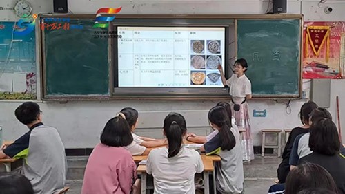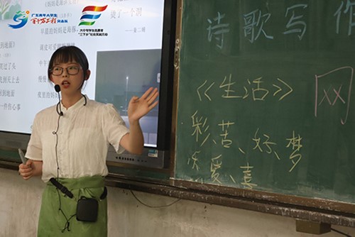 本网讯 为强化学生们普通话的发音与运用能力,加大国家通用语言文字推广力度,广东外语外贸大学中文学院悦普长歌服务队于7月11日抵达清远市英德市黄花镇黄花中学,开展为期两周的暑期“三下乡”实践活动。队伍围绕汉语言文学开展现代诗写作课程,提升学生的写作和鉴赏能力;为了进一步提升学生的学习兴趣,队伍开展瓦当团扇绘制、黏土创意课两门美育课程,寓教于乐,培养学生的动手操作能力和创造性思维。