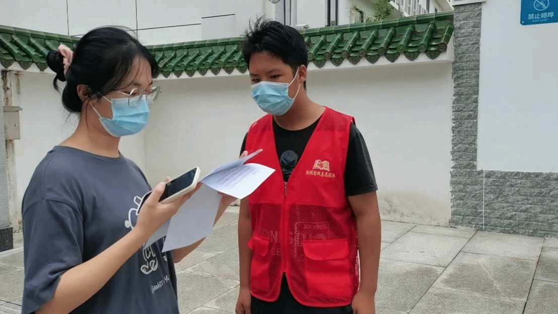 (Shimmer服务队队员在河源市烈士陵园采访工作人员 朱桂贤摄)