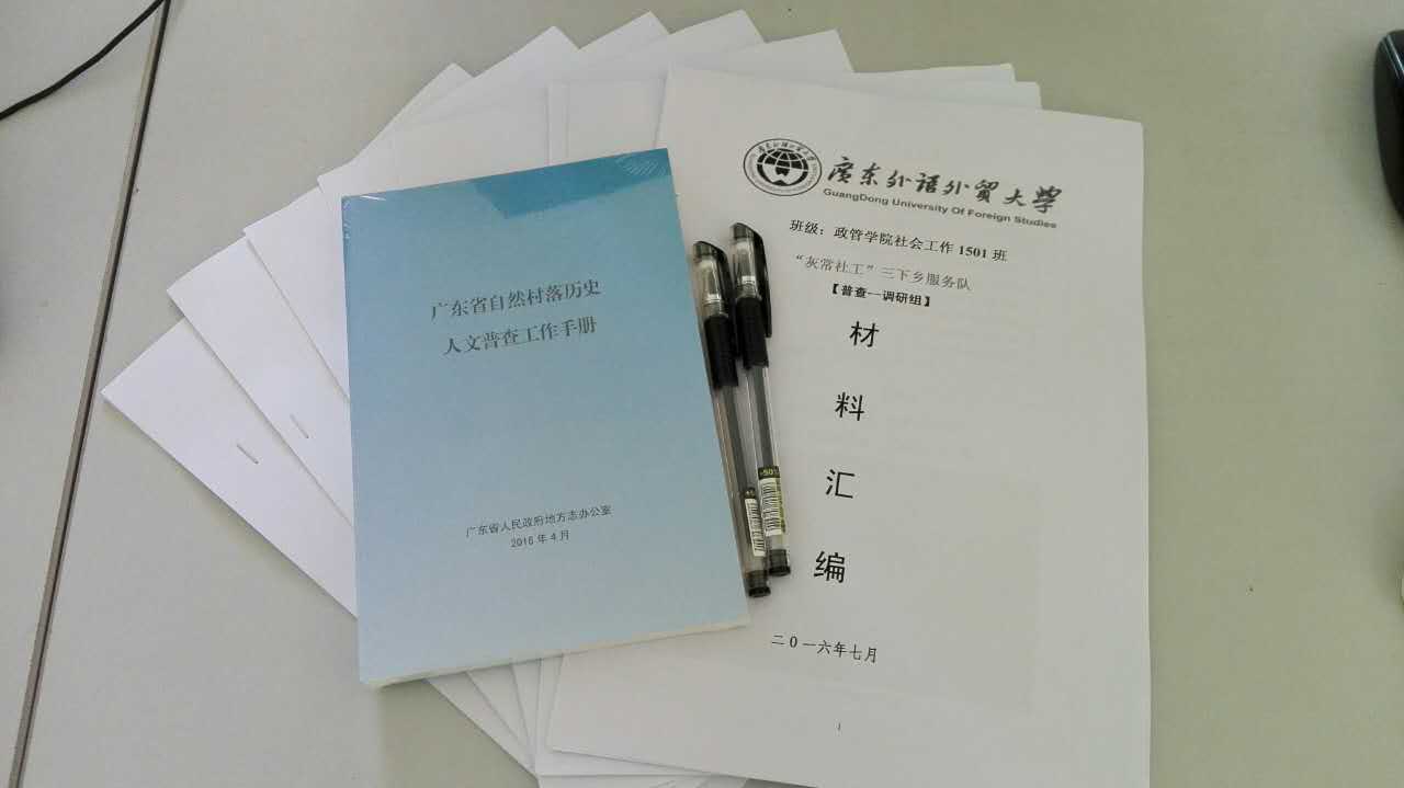 7月9日是广东外语外贸大学政治与公共管理学院社会工作1501班“灰常社工”三下乡服务队来到实践基地石灰铺镇的第二天。这天上午9时,“灰常社工”三下乡服务队的普查小组在石灰铺中学电子阅览室开展了第一次普查培训会。本次培训会的内容主要是历史人文普查工作的介绍,以及小组与任务的分配。