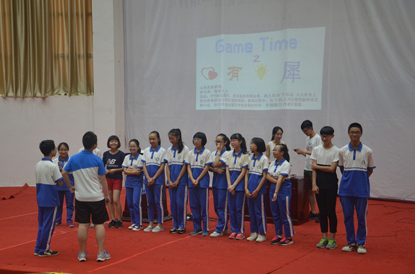 本网讯2016年7月9日星期六,来自广外东方语言文化学院的三下乡队伍one for all到达了梅县外国语学校。队员们举行了开营仪式,通过独具语种特色的自我介绍,和多姿多彩的才艺表演以及与学生们一同玩有趣的游戏,与学生们打成一片,共度欢乐时光。
