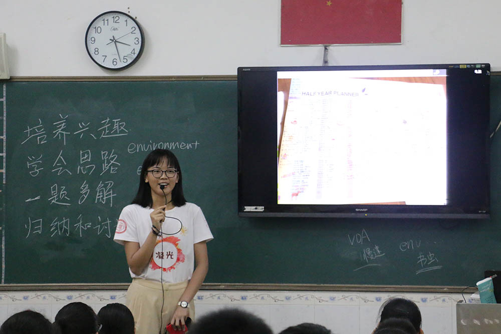 吴雅琪老师与学生分享了关于数学的学习方法。初中数学成绩一直保持优异的她总结了数学学习的四个关键点:培养对数学的兴趣、学会答题的思路、培养“一题多解”的习惯、在课后多多归纳和与同学讨论。岳雨笛老师则与学生交流了英语学习中听、说、读、写四个方面的学习方法。同样成绩超群的岳老师向学生们介绍了自己“拆分音节”来背单词的记忆方法,并推荐学生们合理利用英语学习的应用软件,以提高听力水平。台下的学生们饶有兴致,聚精会神,边听取老师们的经验分享,边用心地做笔记。