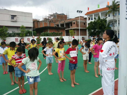 第二节课结束后,操场迎来了一群对跆拳道满是好奇心的学生,跆拳道老师李海萍穿着白色的训练服,神采奕奕地走向同学们。这批上跆拳道的学生,包括三四五年级大部分的学生,看着同学们的热情,老师在紧张有序的情况下先让他们排好队列,然后跑校道,热热身;紧接着做准备运动。在老师的悉心教导之下,同学们有模有样地正冲拳。弹指一挥间,40分钟的跆拳道兴趣课就结束了。