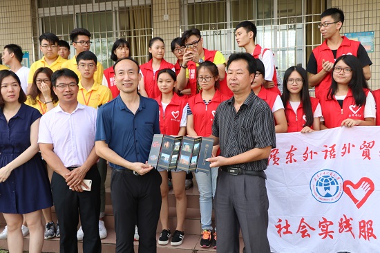 罗海洋向廊田中学校长沈孝荣赠送广外校庆纪念品