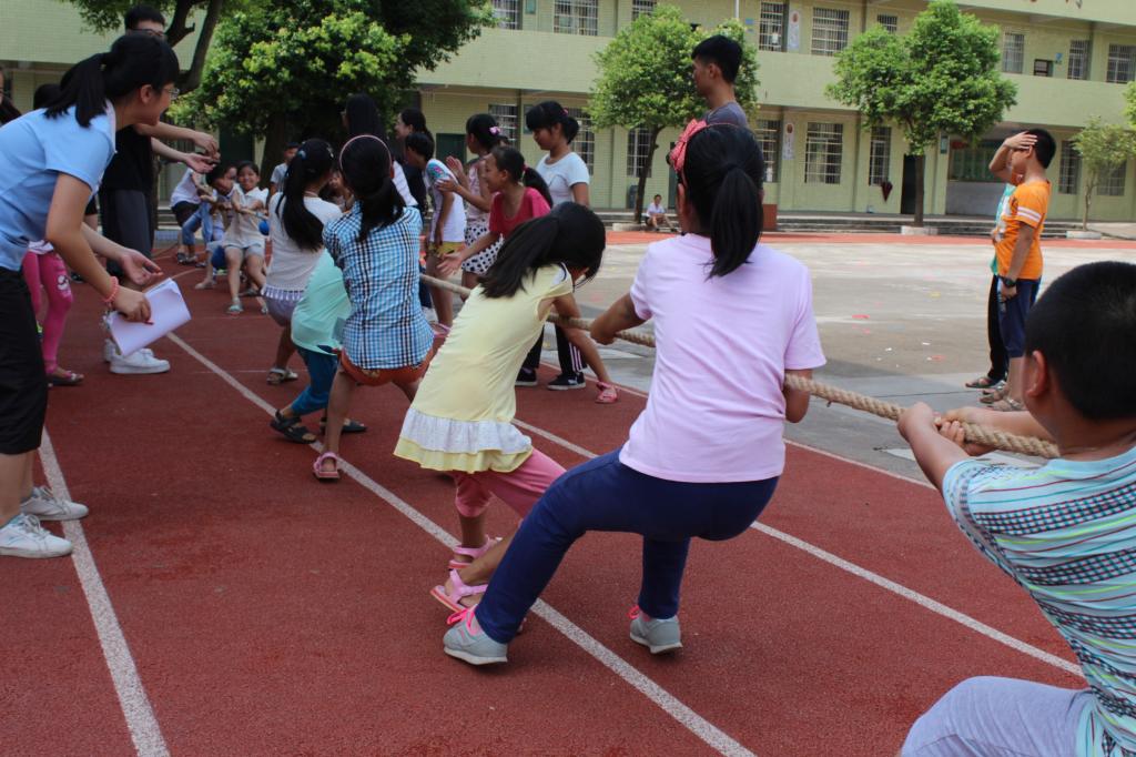 在烈日炎炎下,经过了前两个游戏项目,同学们早已汗流浃背,然而他们的精力却丝毫不减,依旧十分旺盛,一直高呼继续游戏比赛。正如“小小的身体,拥有着大大的力量”,在“趣味接力赛”环节上,一个个瘦小的身影在跑道上飞奔驰骋,一个小小的接点拍掌,连接团结和友爱,传递勇气和力量,演绎奋斗和奔跑。最后,到了最体现小组团队力量的“拔河”比赛,每轮比赛都有着不同出色的表现,其中,有“似乎还没开始就已经结束”的秒速淘汰赛,也有“势均力敌”的冠军赛,组内成员不停地欢呼加油。在旁边观赛的义教老师们也时不时的发出呐喊声,被同学们的热情所感染,并纷纷投入比赛,和学生们一起并肩作战。