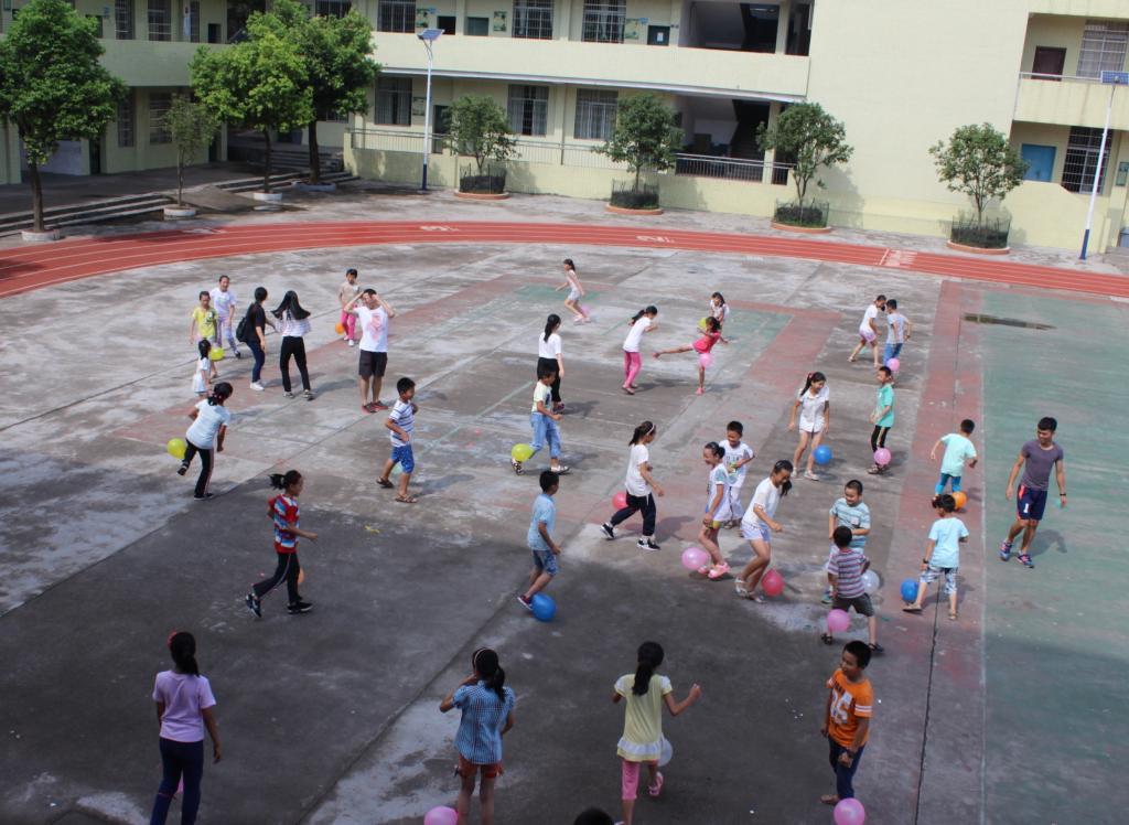 本网讯2016年7月14日,对一路向北三下乡服务队员和小朋友们来说,是充满活力与趣味的一天。今天,队员们在老坪石中心学校操场上举行了一场耐人寻味的运动会,同学们参与度极高,总共有33名同学参与。在此次趣味运动会上,共有4个活动项目,分别为:踩气球、三人四足、趣味接力赛和拔河比赛。