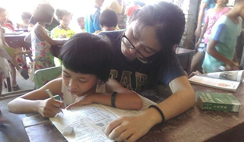 下午义教组在小草书屋辅导小朋友们完成暑假作业。有些作业用到了初中甚至高中的知识,队员们在教他们解题方法前,还耐心地给小朋友们补充讲解他们还没学过的概念。