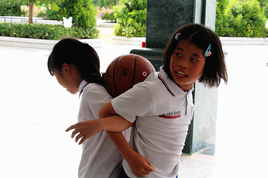 第三个项目名为“螃蟹赛跑”,两队分为八个两人小组进行接力。行进过程中两人只能用背部夹住一个球,绕过中庭的第三个柱子再回到起点,总用时较短的队伍获胜。比赛中尽管有些孩子有配合不够默契之处,球掉到了地上,但现场仍是欢笑不断,两个队伍都很快完成了任务。最后“蒲公英”队用时最短,取得了第三个项目的胜利。