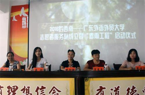 “我志愿,我行动,我服务,我快乐”胸前的志愿手和洪亮的宣誓声为2016黔西南——广东外语外贸大学第四期“春雨工程”启动仪式划上圆满的句号。