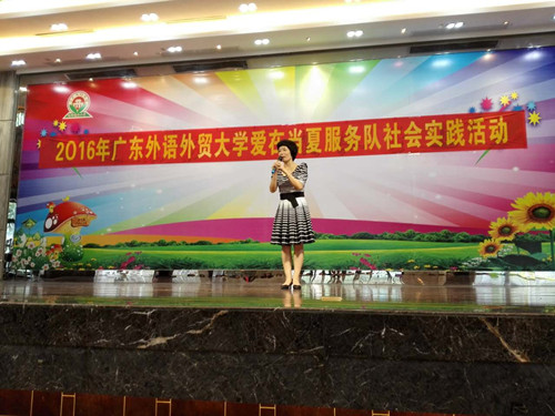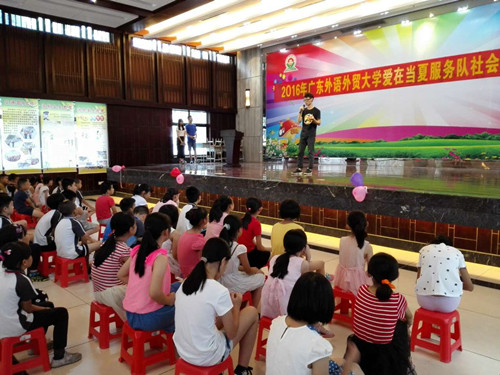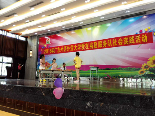 本网讯2016年7月21日,广东外语外贸大学商学院“爱在当夏”三下乡服务队在佛山市顺德区鸡洲锡全小学大礼堂举行了隆重的毕业典礼暨欢送会。鸡洲锡全小学校长黎瑞萍和两位前任校长应邀出席典礼。现场气氛活跃,精彩纷呈。