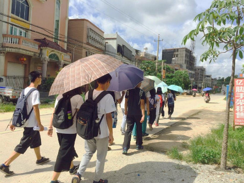 今天早上9点,调研组到高埔镇上,继续派发留守儿童家庭教育情况调查问卷。经过昨天下午在葵坑村的问卷派发任务的顺利完成,大家对于走访村落更多、范围更大的镇上家庭充满了期待和紧张。有的人还提出要一起唱歌,让情绪高涨起来。