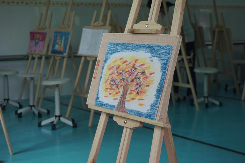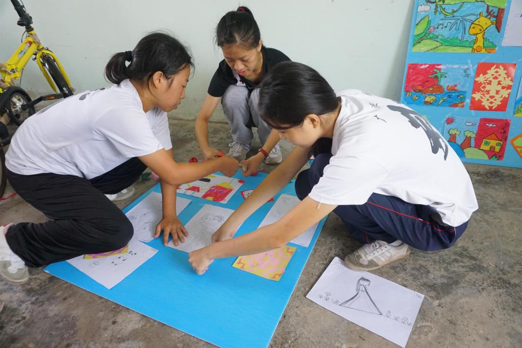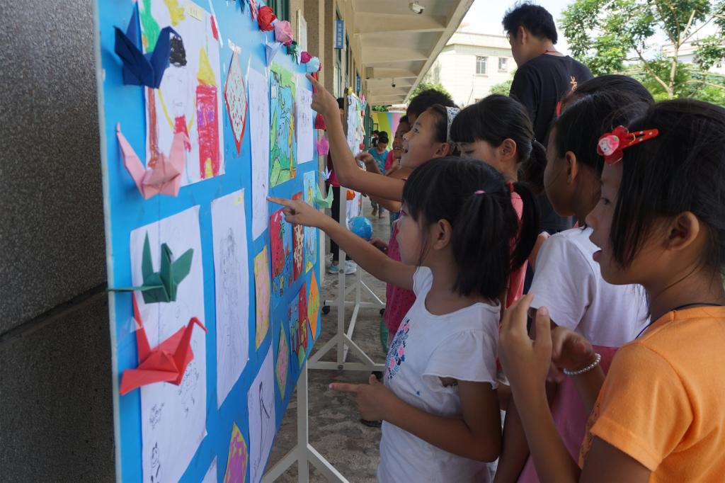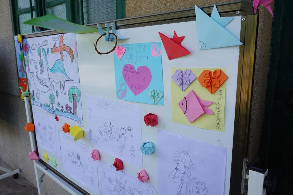 队员们用孩子们折的玫瑰,百合,莲花,千纸鹤做点缀,把孩子们的画,剪纸错落有致地粘贴在KT板上,还有孩子们送给老师,送给爸爸妈妈的爱心卡纸。经过大家一个上午的悉心搭配,色彩缤纷的画展布置好了。