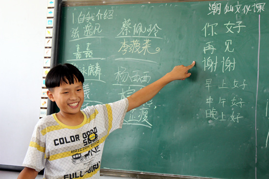 早上,老师们也准时来到课室,坐在台下。孩子们首先让老师上台自我介绍。随后开始为老师们准备的潮汕文化课。第一部分,孩子们主要教授了一些潮汕话日常用语,如“你好”“再见”“谢谢”“早上好”等等,老师们也认真地在台下跟读。