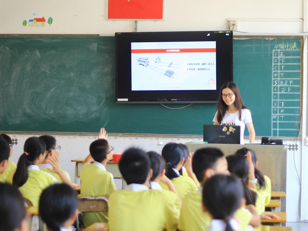 首先,来自“凝光”三下乡服务队调研组的赖菀桃老师代表调研组第一次跟“凝光”班的同学们上课,她通过哈佛大学一个著名的公开课“公正,该如何是好”中的两个火车两难问题和同学们探讨在极端情况下,公平与正义的道德问题。由于大都是第一次接触这样的课程,而且探讨的问题都是在极端情况下,同学们的脸上表现出一种尴尬的为难,不知如何是好。通过这节课,习惯了答案只有正确与否的同学们,明白有些答案其实并无对错,关键在于同学们的看法如何,并学会了如何辩证思考。接着,周嘉颖老师给同学们介绍了世界各地的礼仪文化。周老师从当地的地理、宗教、人文、气候和民族等方面来介绍该国或地区的礼仪文化,加深了同学们的理解。课堂中,周老师不仅自己亲身示范各种动作,还邀请同学们上台表演,让同学们学以致用。最后,卢博文老师给同学们介绍了与秦始皇有关,但在历史课本上没有提到的历史故事,例如秦始皇的样貌、童年经历和趣闻等。他还跟同学们多层面地探讨“为什么秦始皇想要长生不老?”等问题,让课堂的活跃度大大增高。