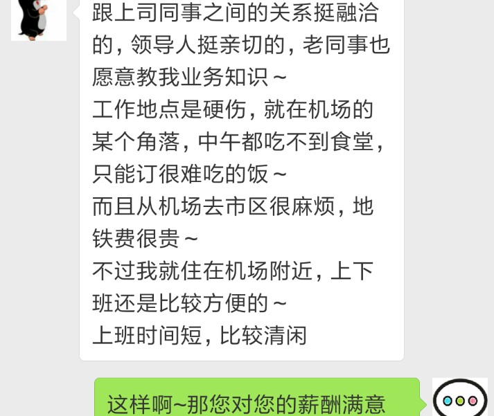 不过,当被问及单位的客观条件是,师姐给出的答案是:工作地点是硬伤,就在机场的某个角落,中午都吃不到食堂,只能订很难吃的饭。