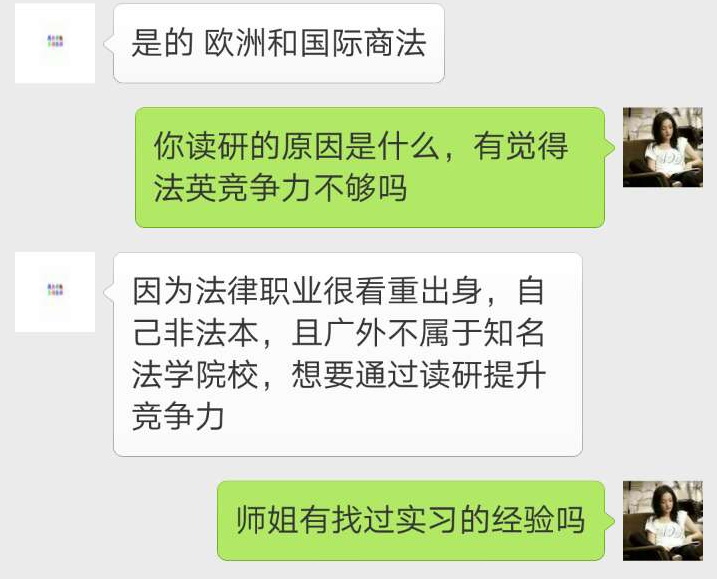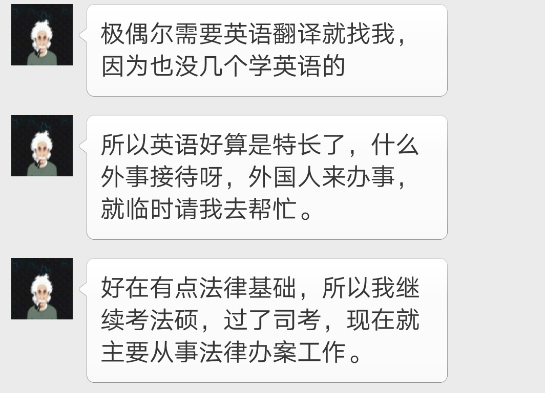 下午,小组成员又联系了另外一位已经就业几年的师姐。师姐毕业选择了考公务员,后来继续深造读了在职法律硕士研究生,并且考过司法考试,目前主要从事法律办案工作。谈到就业,师姐说到虽然现在日常工作中不常用英语,但是英语却成了一个特长,工作中有外事接待的时候经常能够帮上忙。而在法英专业所学的法律知识为她日后读法硕打下了一点基础。