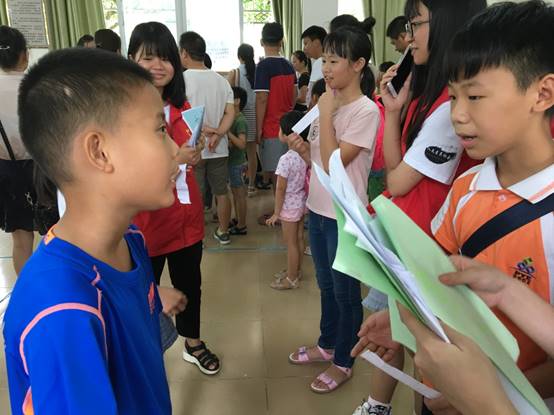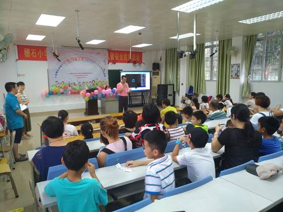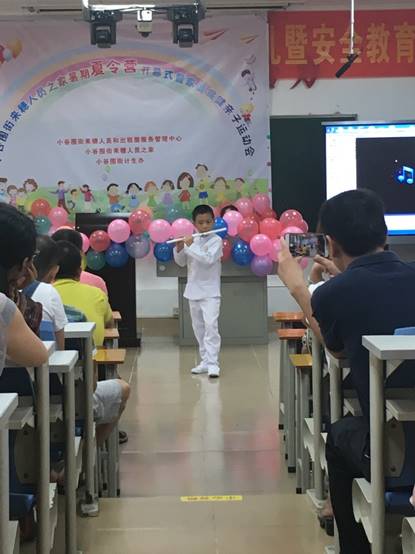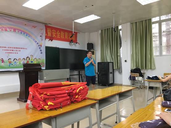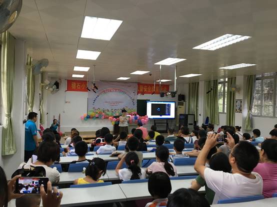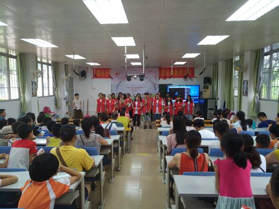 在我校爱飞翔·方舟起航服务队志愿者的指引下,家长带领着孩子有序地签到并进入会场。9时许,暑期夏令营开幕式正式开始。