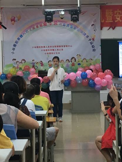 随后,小谷围街来穗人员和出租屋管理服务中心的张主任致开幕词。张主任同样对前来支持此次暑期夏令营活动的家长和爱飞翔·方舟起航服务队志愿者们表示了欢迎及感谢,并嘱咐孩子们在学习的过程中要遵守纪律,希望他们在此次的夏令营活动中有所收获。