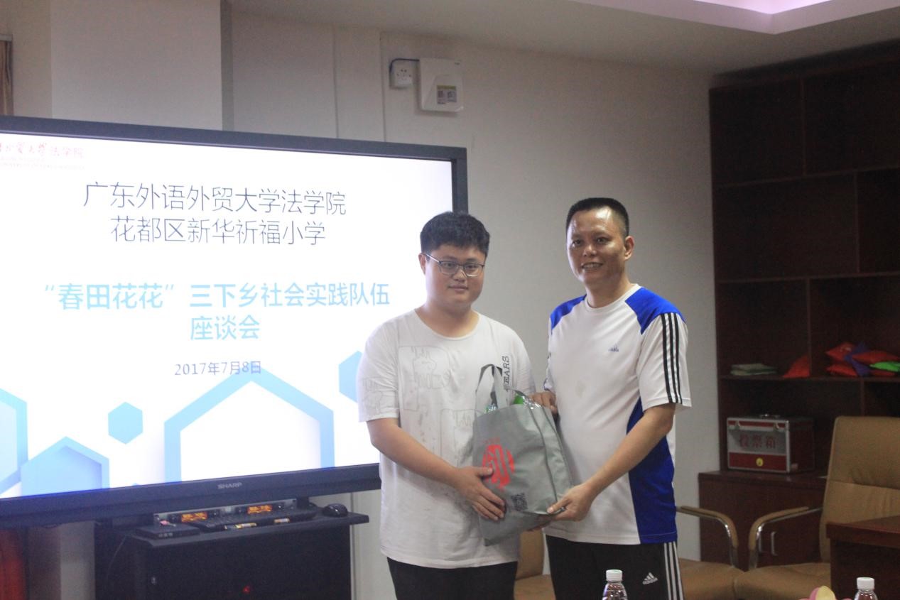 林茂辉副书记对祈福小学的学校环境,基础设施,教学设备等表示充分肯定,并指出三下乡活动要让大学生担重任,大学生不能从校门到校门,再到校门,而是要走出校门,走进社会。王校长表示欢迎广外法学院的学生到祈福小学进行三下乡社会实践活动,让学生有一个发挥能力的平台,提出年轻人应该敢于担当重任,并对学校概况做了介绍。