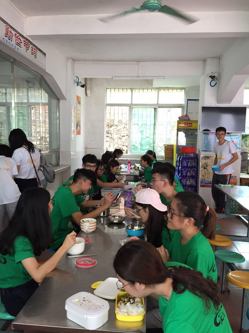 之后队员们在互助中将行李搬进宿舍并各自休整。中午时分,全体队员在宿舍楼下的小饭堂吃午餐。队员们拿着各自的饭盒和学校的饭票打饭。打饭的叔叔很是亲切,耐心有礼。饭菜是简单的一饭三菜,吃完后还要亲自动手洗饭盒,久违的经历仿佛回到了高中时代。