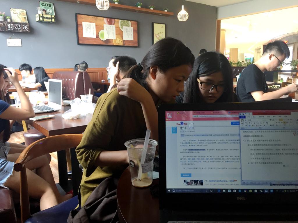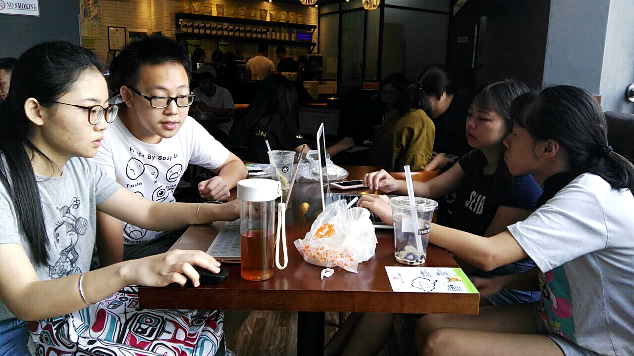 本网讯7月10日是超级无敌老乡队调研的第四天。因为队员们在前两天已经收集到了200份问卷数据,所以队伍决定修改今天的任务,改成对调查问卷所得到的数据进行分析汇总,完成调研报告的初稿。于是,队员于下午一点到达百利广场的一间奶茶店集合,开始工作。这一次,队员们分为四个小组。