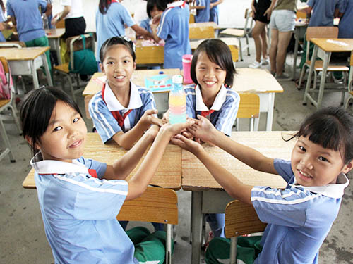 义教组组员今天为学生安排的特色课程是海洋瓶制作。当组员们将五彩斑斓的水晶泥拿上讲台的那一刻,四年级的教室瞬间被学生们震耳欲聋的欢呼声淹没。每位学生都拿着事先准备好的塑料瓶跃跃欲试。在拿到队员分发的各色水晶泥和用来压碎水晶泥的针管后,有的小组静静地开始了制作,而有的小组七嘴八舌,迟迟不知道如何下手。经过一节课的努力,四年级的大部分同学都完成了属于自己的海洋瓶制作。学生们大都对完成了的作品爱不释手,像对待自己刚生出的新生儿一般捧在手中不肯撒手。他们给自己作品所起的名字更是让人啼笑皆非——“乱七八糟瓶”“知心瓶”“彩光瓶”……