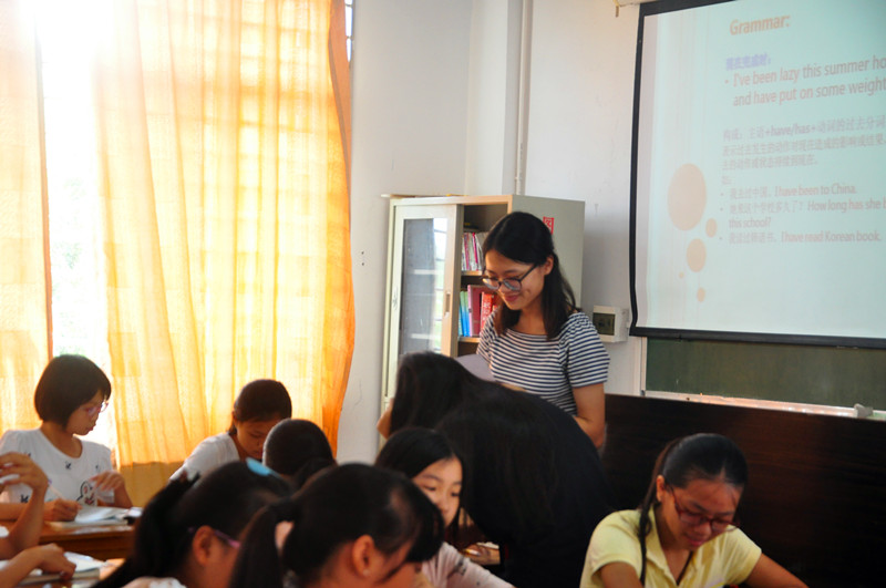 校内,100多名学生朗朗的读书声充满了整栋教学楼,给这个校园带来了活力。8点20分,“自强之心”服务队其他成员为东园中学学生上了第一节课。交际英语、阅读课、语音语调,各班的第一节课虽然不同,但都富有趣味性和知识性。接下来服务队更是结合广东外语外贸大学外语特色开展了与英语有关的系列课程,旨在提高学生整体的英语水平。除英语课程外,为扩展学生们的视野,提高他们自我展示的能力,让他们了解到更多有趣且有用的知识,服务队还开展了其他拓展类的课程。例如下午的演讲与辩论技巧、希腊神话故事、策划课等。此外,服务队也注重劳逸结合,为学生们提供了武术、羽毛球等体育课程。